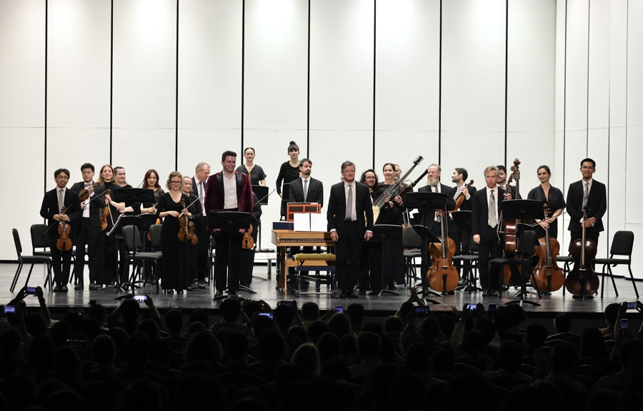 不过,乐团对上海的爱还伴随着一丝无奈,尤其来自弦乐手。原来,英国合奏团演奏巴洛克音乐,使用仿古乐器和羊肠弦。羊肠弦对湿度的变化极其敏感,在上海潮湿多变的天气中,音高容易波动,非常不稳定。乐手们必须提前一小时到达舞台,进行精细而痛苦的调音,确保这些“不听话”的古老乐器能乖乖配合演出。