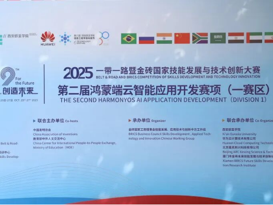2025年10月25日至27日,由金砖国家工商理事会中方理事会、一带一路暨金砖国家技能发展国际联盟、中国科协一带一路暨金砖国家技能发展与技术创新培训中心等单位共同主办,中国发明协会、教育部中外人文交流中心联合主办,金砖国家工商理事会(技能发展、应用技术与创新中方工作组)承办,西安欧亚学院、华为云计算技术有限公司、北京嘉克新兴科技有限公司、厦门市金砖未来技能发展与技术创新研究院联合承办的“2025 一带一路暨金砖国家技能发展与技术创新大赛 —— 第二届鸿蒙端云智能应用开发赛项(一赛区)”,历经开幕式的隆重启幕与比赛的激烈角逐,最终在西安欧亚学院信息工程学院西区B栋二楼落下帷幕。