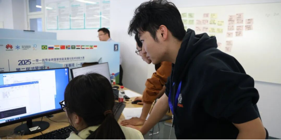 比赛正式开始后,参赛选手们迅速投入竞技状态,围绕鸿蒙端云智能应用开发相关技术模块展开角逐。赛中,西B208考场只见参赛选手飞快敲击键盘,有的紧盯屏幕调试参数,时而就协同模块低声交流——有人指着屏幕指出接口问题,队友便迅速寻找解决方案,彼此间配合无间,尽显团队默契。